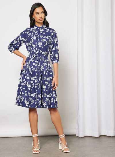 All Over Print Shirt Neck Button Front Puff Sleeve Long Dress